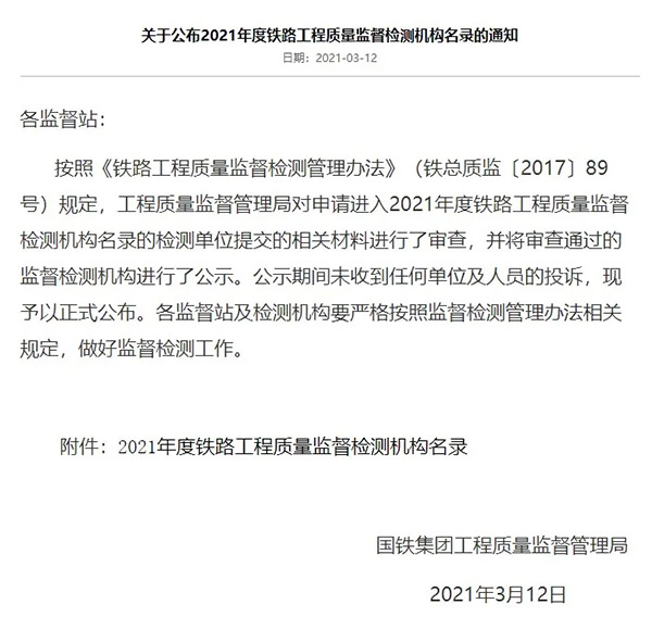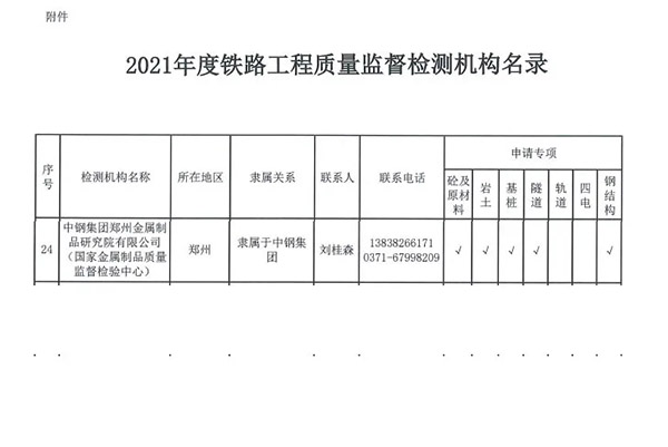 近日,鐵路集團(tuán)有限公司工程質(zhì)量監(jiān)督管理局發(fā)布了《關(guān)于公布2021年度鐵路工程質(zhì)量監(jiān)督檢測(cè)機(jī)構(gòu)名錄的通知》,并將滿足合格條件的91家監(jiān)督檢測(cè)機(jī)構(gòu)進(jìn)行公示,中鋼集團(tuán)鄭州金屬制品研究院(金屬制品質(zhì)量監(jiān)督檢驗(yàn)中心)再次上榜入圍,這標(biāo)志著中鋼國(guó)檢的工程檢測(cè)能力得到了高度認(rèn)可。