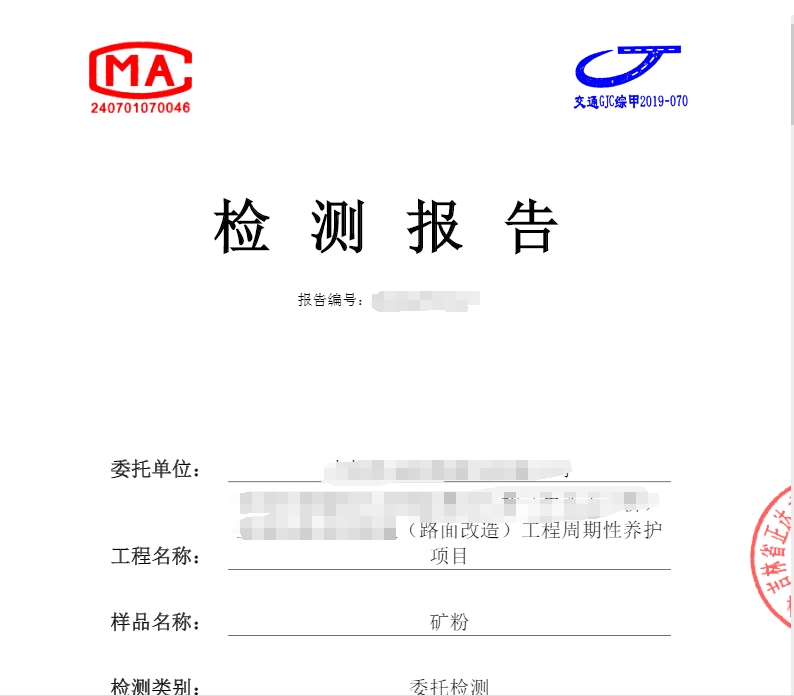 公路用礦粉檢測報告辦理就找吉林省正達檢測,專業(yè)公路工程第三方檢測機構(gòu),公司擁有公路自綜甲檢測資質(zhì),出具CMA檢測報告。